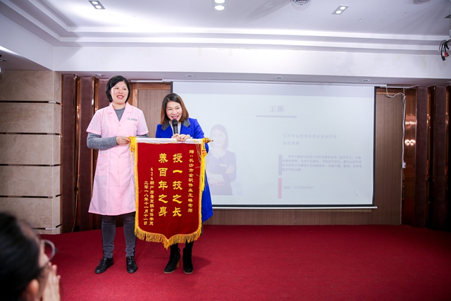 在王琳老師發言結束后,班長雷曉慧代表262期全體產后康復班學員為王琳老師送上錦旗,并感謝王琳老師17天來不辭辛苦的教導。