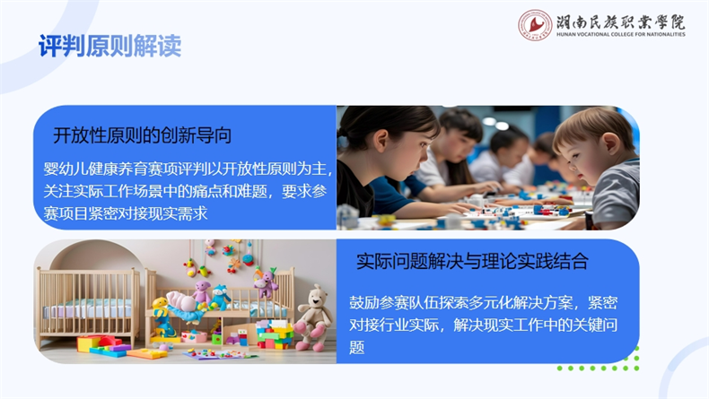 李佳佳副教授強調,嬰幼兒健康養育照護賽項的設立,是對黨的二十大和國家“十四五”規劃的積極響應,旨在培養高素質托育人才,推動專業教育的深化改革,提升學生的綜合素養。因此,在進行項目設計時,必須緊密結合政策背景與行業發展需求。