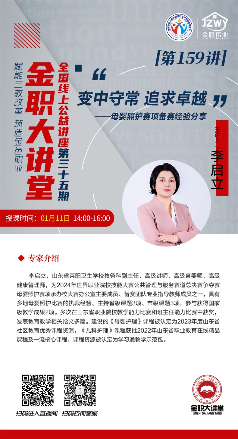 1月11日,金職大講堂將開啟第三十五期第158講,課程將邀請山東省萊陽衛生學校教務科副主任李啟立老師,進行《變中守常 追求卓越——母嬰照護賽項備賽經驗分享》主題授課。