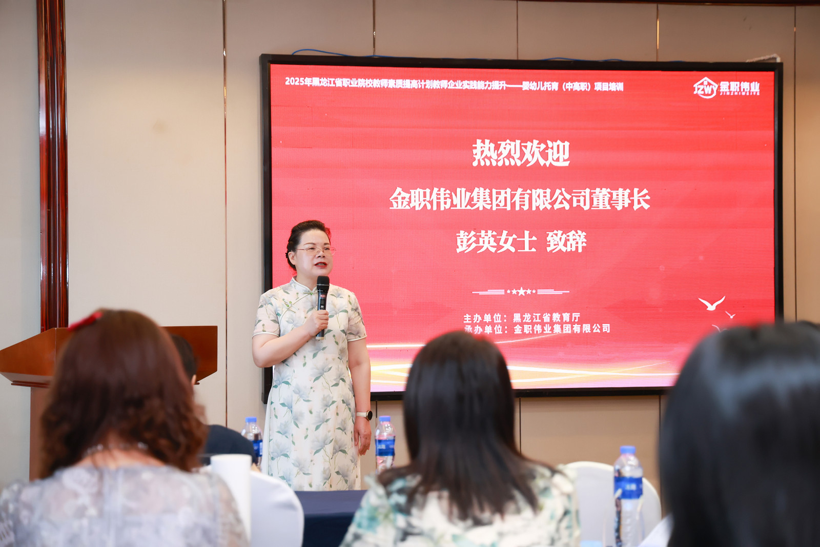 金職偉業集團有限公司董事長彭英女士發表致辭。她指出,嬰幼兒托育行業關系到嬰幼兒的健康成長,關系到家庭的幸福和社會的和諧發展,而職業院校教師作為該領域人才培養的重要力量,其專業能力的提升至關重要。她希望各位學員能夠在培訓中有所收獲,將所學知識運用到今后的教學工作中,為推動嬰幼兒托育行業的發展貢獻力量。